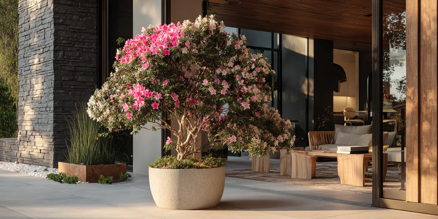 Satsuki azaleas are evergreen hybrids derived chiefly from Rhododendron indicum and selected in Japan for late flowers. They bloom in late spring to early summer, extending azalea season after many older types have finished. Flowers are large, often with striking stripes, margins, or flecks on the petals. Plants are smaller than Southern Indicas and mature slowly. Cold hardiness is modest compared to Kurume types, so they suit Zones 7 to 9 best. They also take to containers and are widely used for bonsai.