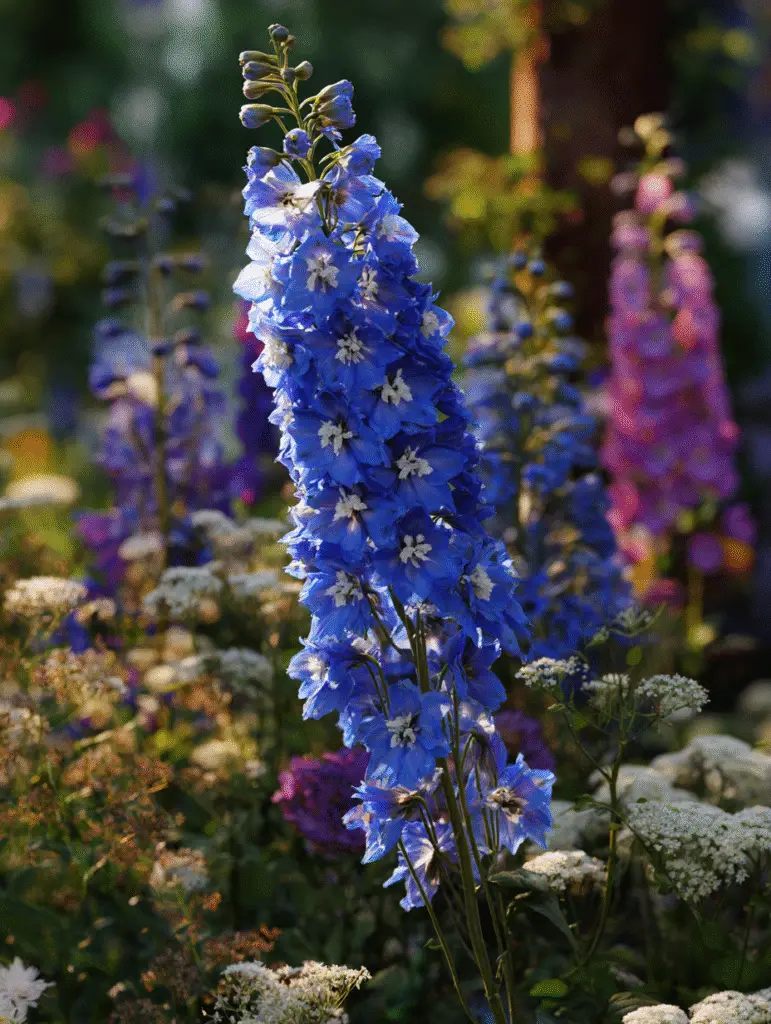 Tall blue spires bring cathedral drama and vertical polish, anchoring the back of borders.