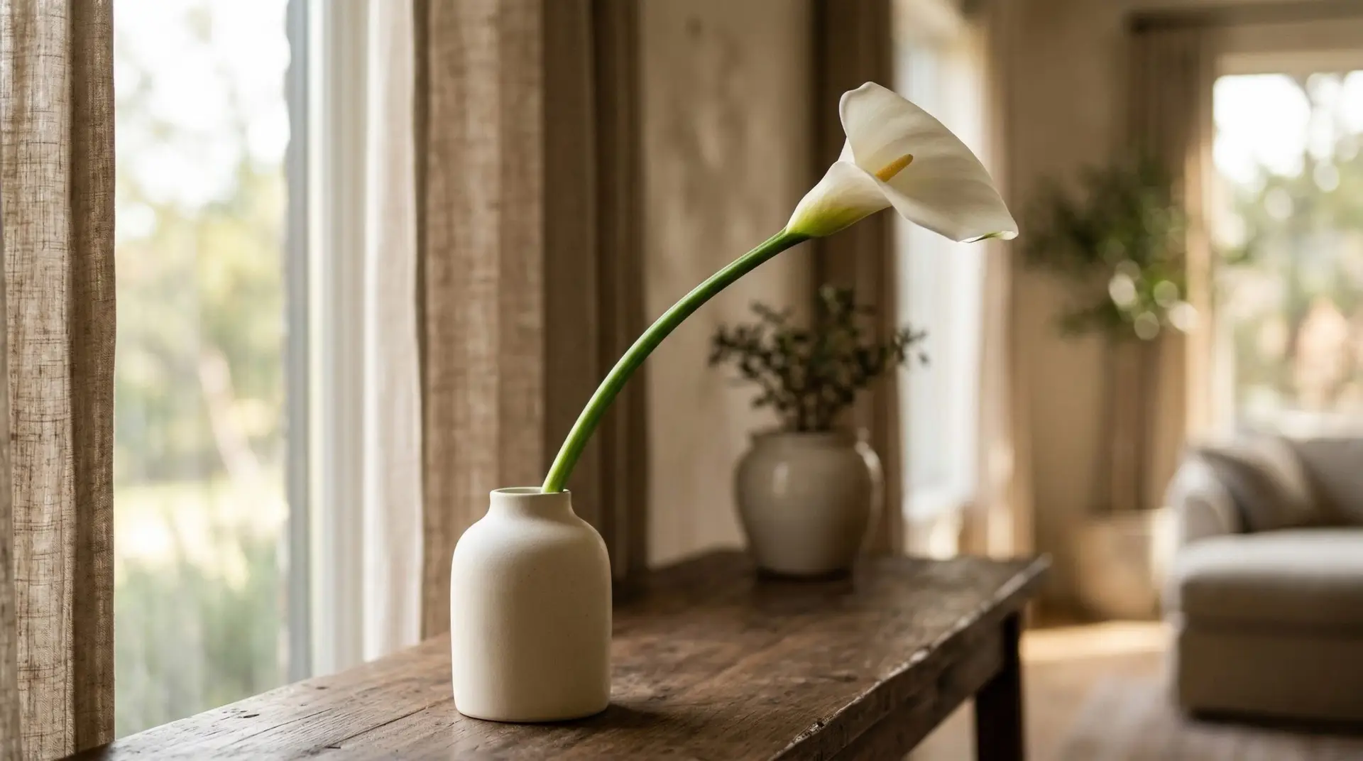 As the day ends, the light in the studio shifts from bright white to a deep, dusty blue. The single calla lily arrangement on the table slowly loses its interior shadows and becomes a flat, graphic silhouette against the darkening window. The thick line of the stem and the elegant curve of the spathe remain perfectly recognizable even when all the color drains from the room. The flower holds its posture through the night, a quiet sentinel waiting in the dark. It is this lasting structural grace that makes the plant so essential for modern spaces. You do not need a loud, overflowing vase to bring life into a room. A single, perfectly placed stem tracing a line in the air is enough to change the entire atmosphere of the space it inhabits.