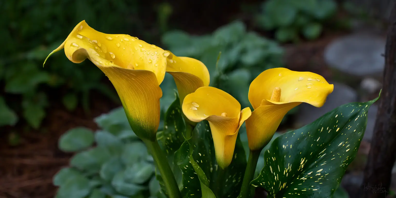 Zantedeschia elliottiana is the golden calla lily known for bright yellow spathes and spotted leaves. It stands out for vivid color and compact growth. Plants perform best in warm summer regions and in containers that warm quickly in spring. It is commonly grown as a seasonal bulb in most of North America. Bloom usually arrives from early summer to midsummer. Leaves carry translucent white speckles that add interest when plants are not in bloom.