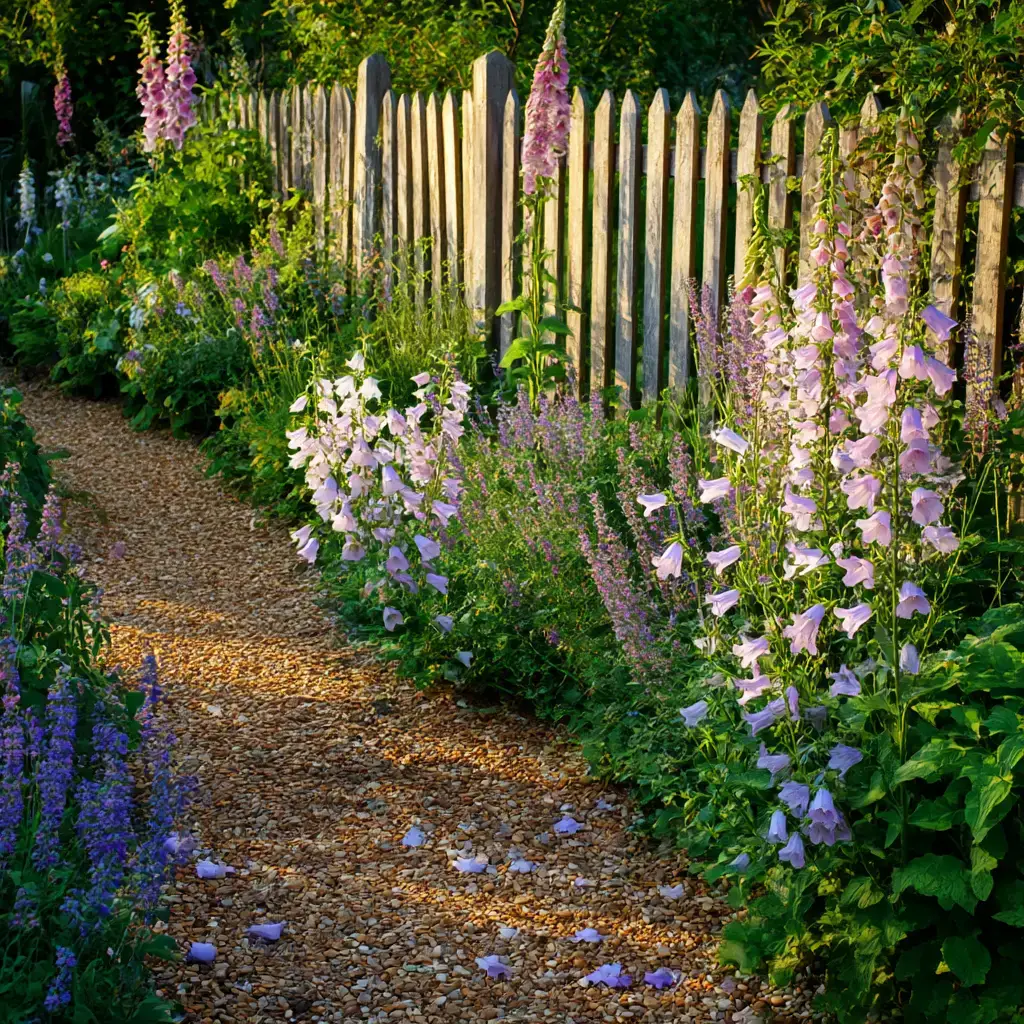 Try airy grasses, salvias, dianthus, coreopsis, roses, and spring bulbs. The cool blue to purple palette of campanulas blends easily with whites and pastels.