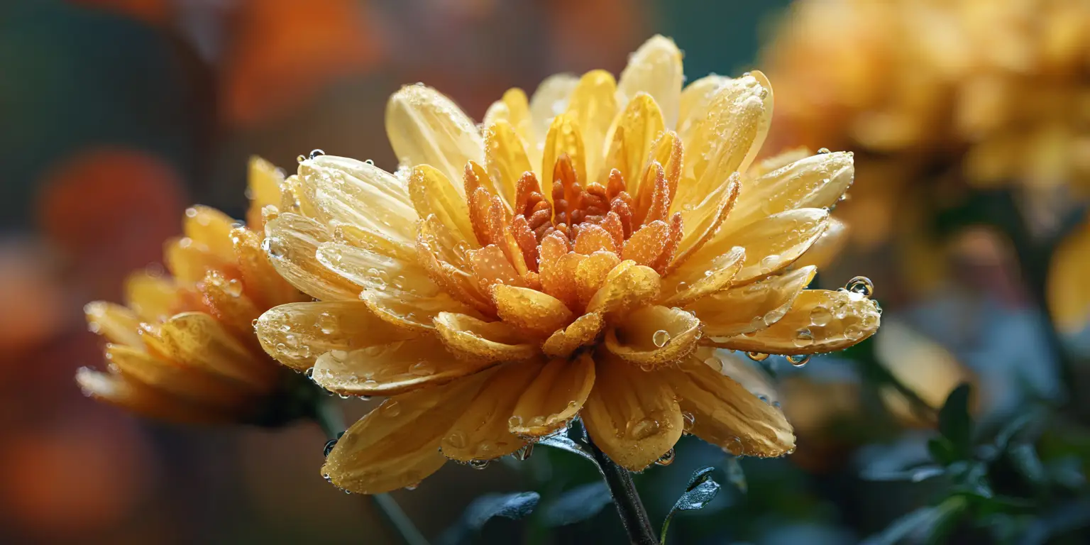 Yellow chrysanthemum with dewdrops, fresh morning macro.