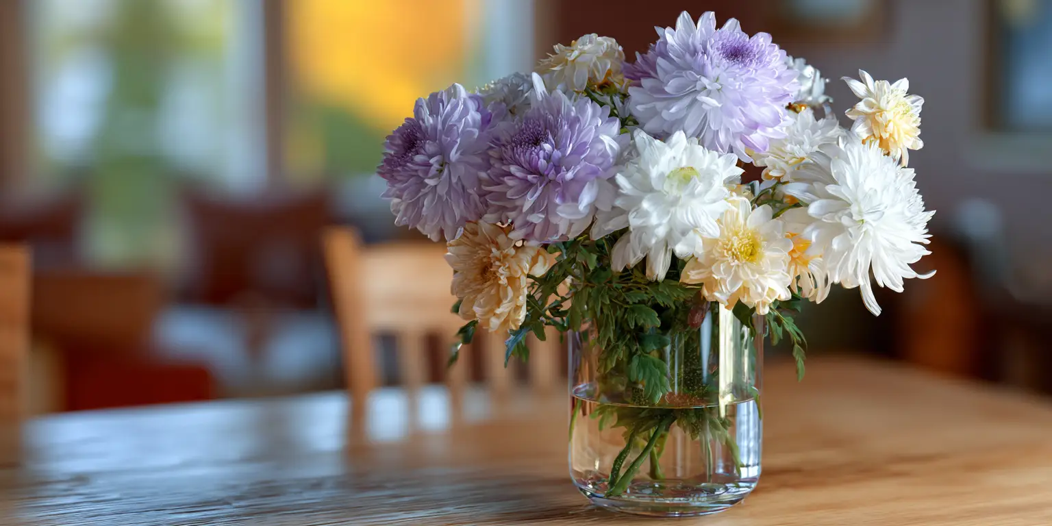 Chrysanthemums are prized in the cut flower industry for their excellent vase life. When cut at the right stage and cared for, chrysanthemum blooms can last a long time in an arrangement – often 7 to 14 days, sometimes up to two weeks or more. This longevity outpaces many other garden flowers and is one reason mums are a florist favorite for bouquets and floral displays. To maximize vase life, start by cutting the stems in the cool of early morning or evening once the flowers are just fully open (avoid cutting blooms that are past their peak). Use clean, sharp pruners or scissors to make a diagonal cut on the stem. Immediately place the cut stems in a bucket of lukewarm water. Before arranging, strip off any leaves that would fall below the water line in your vase, as submerged foliage can rot and foul the water. Arrangers often recut the stems underwater or in running water to prevent air bubbles from entering the stem (which can block water uptake). For the initial vase water, slightly warm water (around 100°F, 38°C) can help blooms hydrate quickly. Mixing in a packet of floral preservative (flower food) provides nutrients and keeps bacterial growth down, further extending the life of the blooms. Once arranged, place your vase of mums in a cool location out of direct sunlight and away from heat sources or drafts. Check the water daily, chrysanthemums are thirsty and will drink a lot. Replenish water as needed, and completely change the water every few days, trimming a bit off the stem ends each time to keep them open and fresh. If any flower heads or leaves start to wilt or decay, remove them promptly to maintain overall bouquet freshness. With these care steps, chrysanthemum flowers will stay attractive for a very long time compared to other cut flowers – it’s not uncommon to see them looking good for nearly three weeks. This makes them economical and dependable for decorating homes, events, or as gifted bouquets, since you can enjoy their rich colors and forms for an extended period after cutting.
