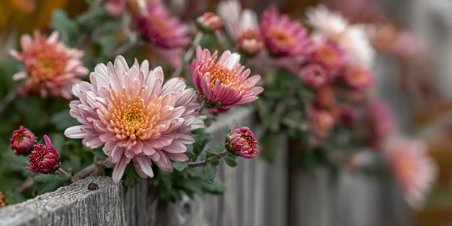Chrysanthemums along rustic fence, bronze blooms and buds.