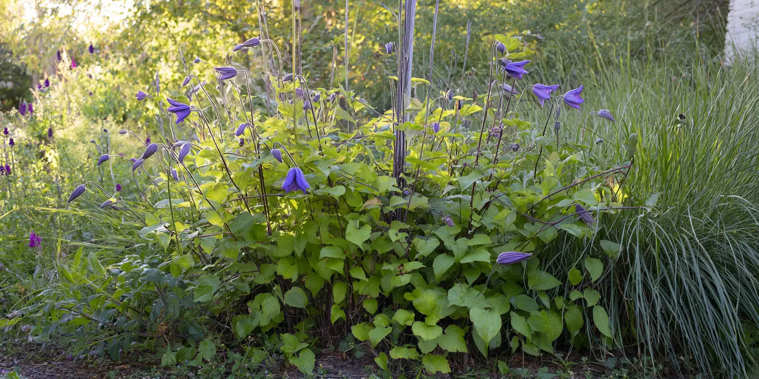 This is a non‑climbing, herbaceous clematis that forms a low mound. It bears solitary, nodding, urn‑shaped blue flowers over a long season. It suits sunny borders and meadow‑style plantings where light staking is possible. Stems die back to the woody base each year in cold regions. It prefers cool, evenly moist soil with good drainage. Seed heads provide ornamental interest after bloom.