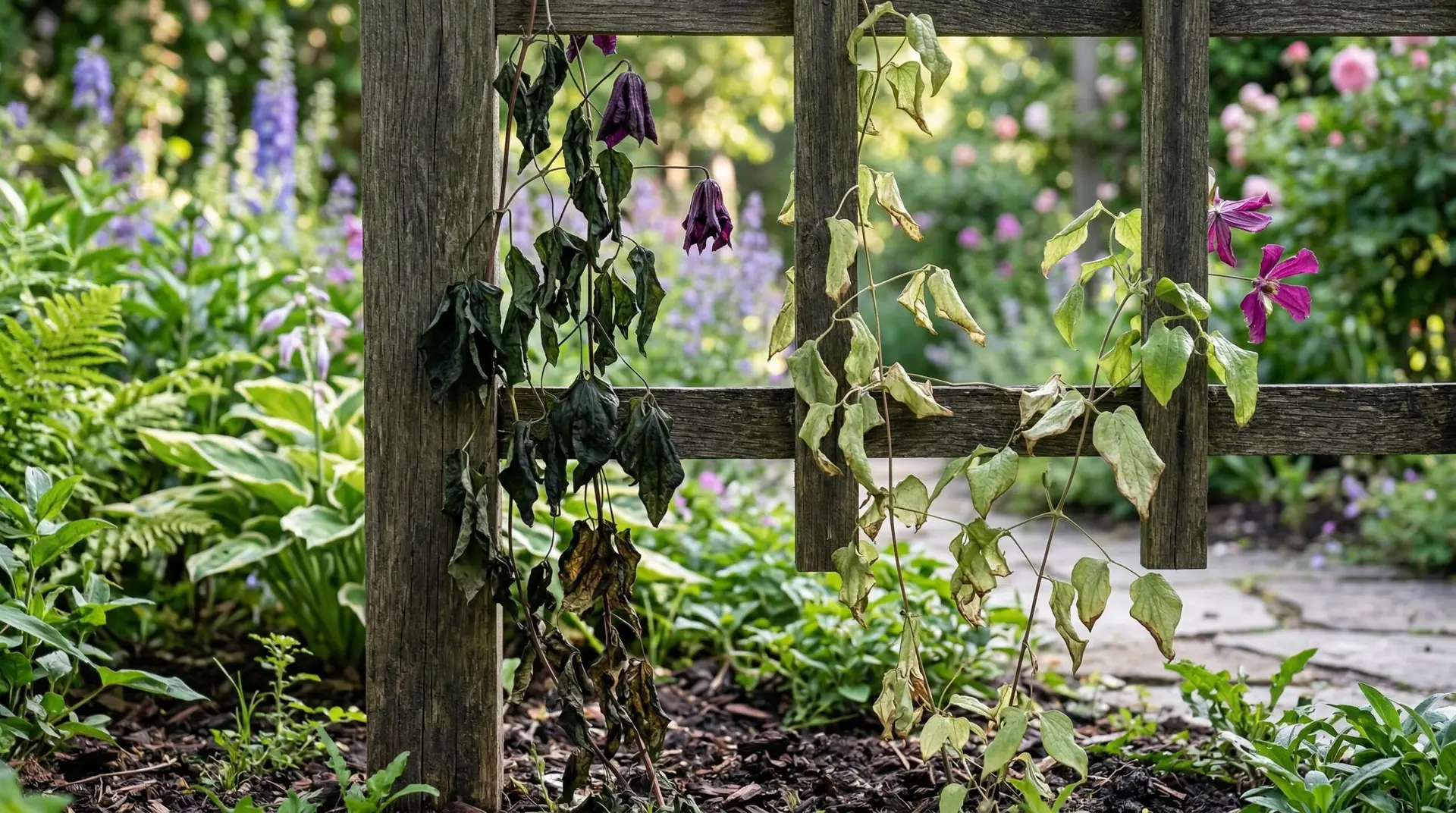 Before you start cutting away at your plant, you need to confirm whether you are dealing with a fungal infection or a simple watering issue. True clematis wilt is caused by a specific fungus that typically attacks the large-flowered hybrid varieties just as they are preparing to bloom. When this fungus infects the plant, it usually targets one or two specific stems at a time rather than the entire plant all at once. The leaves on the affected stems will turn black and the stems will collapse rapidly, often within a single day. If your entire plant is drooping slightly but the leaves are still green and pliable, you are likely looking at heat stress or dry soil rather than a disease. You can test this by watering the base of the plant deeply and waiting a few hours to see if the foliage perks back up.