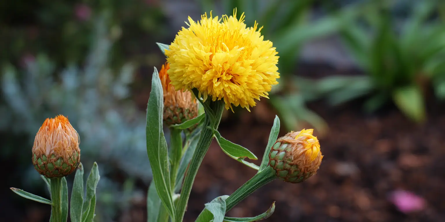• Summer‑blooming yellow heads instead of spring blue flowers