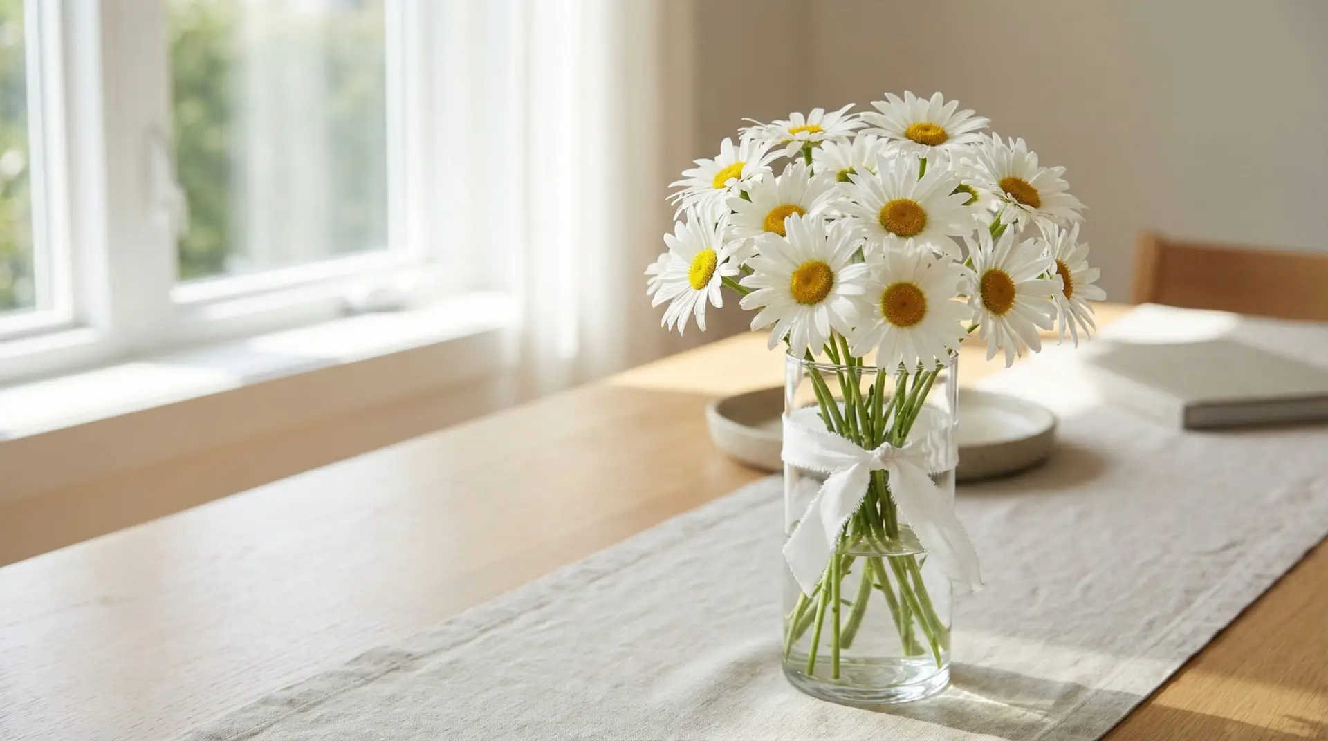Assembly: strip lower leaves | spiral 12 daisy stems into a loose round | tie with ribbon | trim ends evenly | place in water