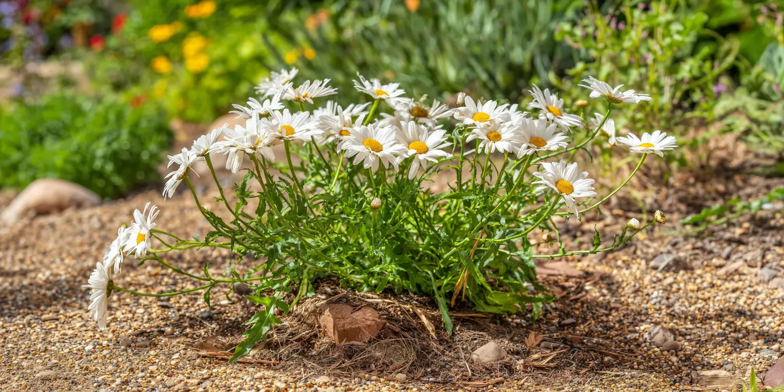 In zones 4 to 6, Shasta Daisy benefits from winter mulch. After the ground freezes, scatter 2 to 4 inches of clean straw or shredded leaves over the crowns, which is 5 to 10 centimeters. The goal is consistent cold and moisture, not warmth. Remove most of the mulch in spring as soil thaws. In zones with frequent freeze and thaw cycles, mulch helps prevent frost heave that lifts crowns and exposes roots. In zones 7 to 9, a light mulch keeps soil from swinging wildly in temperature and helps conserve winter moisture. If repeated thaws lift a plant, gently press it back into contact with the soil during a mild spell and top up the mulch. Do not bury the crown. Make sure the bed drains so meltwater does not pool around crowns. Winter wet is more dangerous than cold in many regions. In areas with voles, line the planting hole with a vertical sleeve of half inch hardware cloth and remove it in spring, or place a coarse gravel collar around the planting area to discourage tunneling. Keep grass and weeds trimmed near the bed. Avoid deep organic mulch right against the crown in winter because it offers cover for chewing pests. In cold zones, containers are more exposed than in ground plantings. Move pots to an unheated garage or against a wind sheltered north wall once consistent hard frosts arrive. Water sparingly through winter so the root ball does not completely dry. In mild coastal areas, group pots together and wrap the cluster with burlap stuffed with dry leaves to buffer wind.