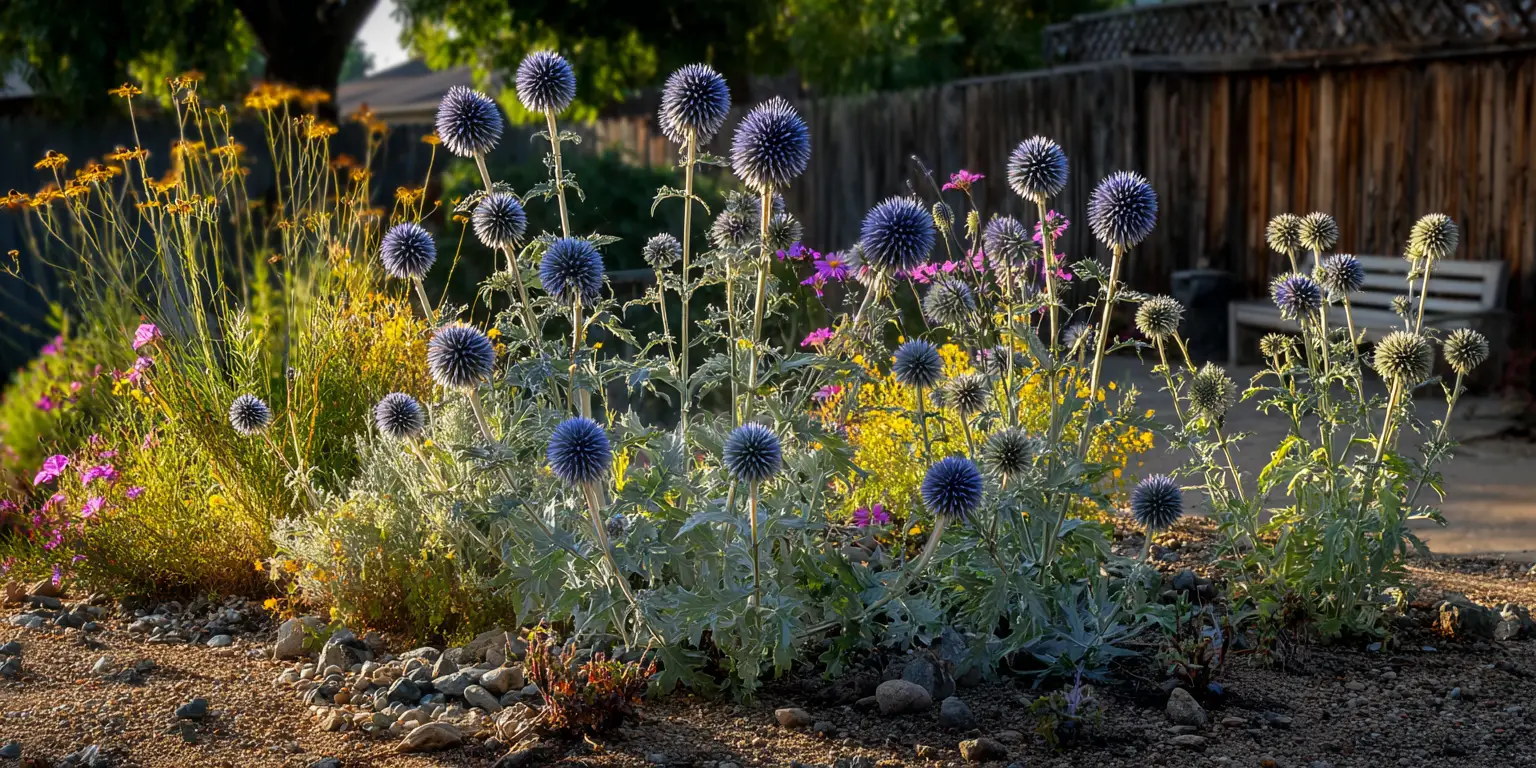 The blue spheres of globe thistle pop against warm colors and echo other cool tones. Pair with coneflowers, yarrow, and rudbeckia for a classic prairie blend. For a cool palette, interplant with catmint, Russian sage, and salvias. In cottage borders, it sits comfortably near roses, tulips, and lilacs where the graphic form balances softer flowers. For a theme bed with harmonious blues and whites, explore ideas from hydrangea macrophylla, lavender, sunflower, and daffodils guides to coordinate bloom timing and height.