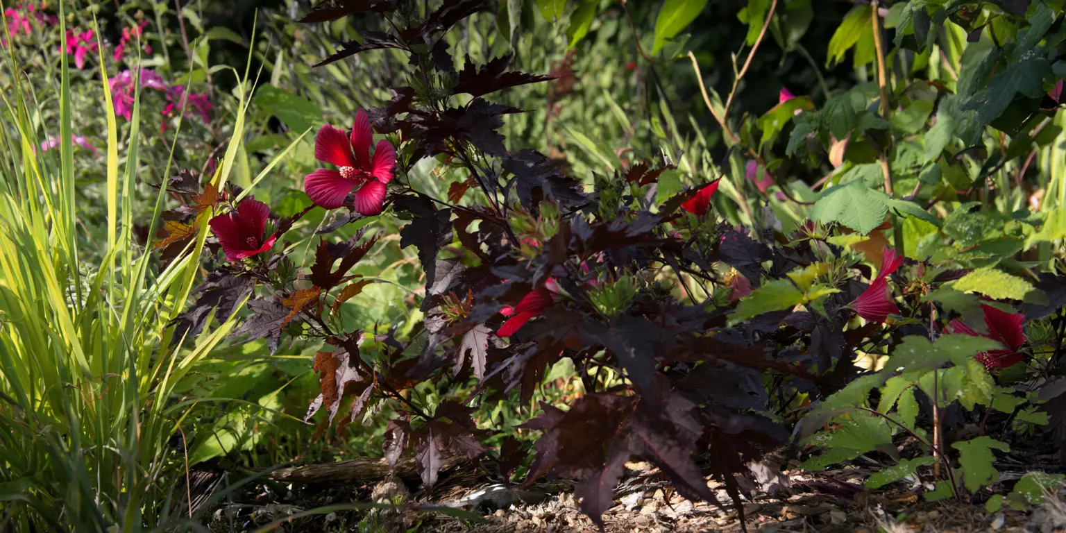 - Color & flower form: Small maroon to pink hibiscus flowers. Foliage burgundy to purple