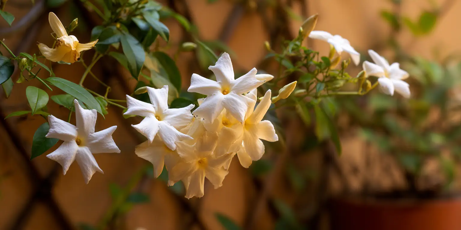 Spanish or Catalonian jasmine bears very fragrant white flowers on a twining, semi‑evergreen climber. It is tender to frost and is best kept in containers in much of North America. Bloom is heaviest from summer into fall with warm days and nights. Grow where it can be protected and enjoyed up close for scent.