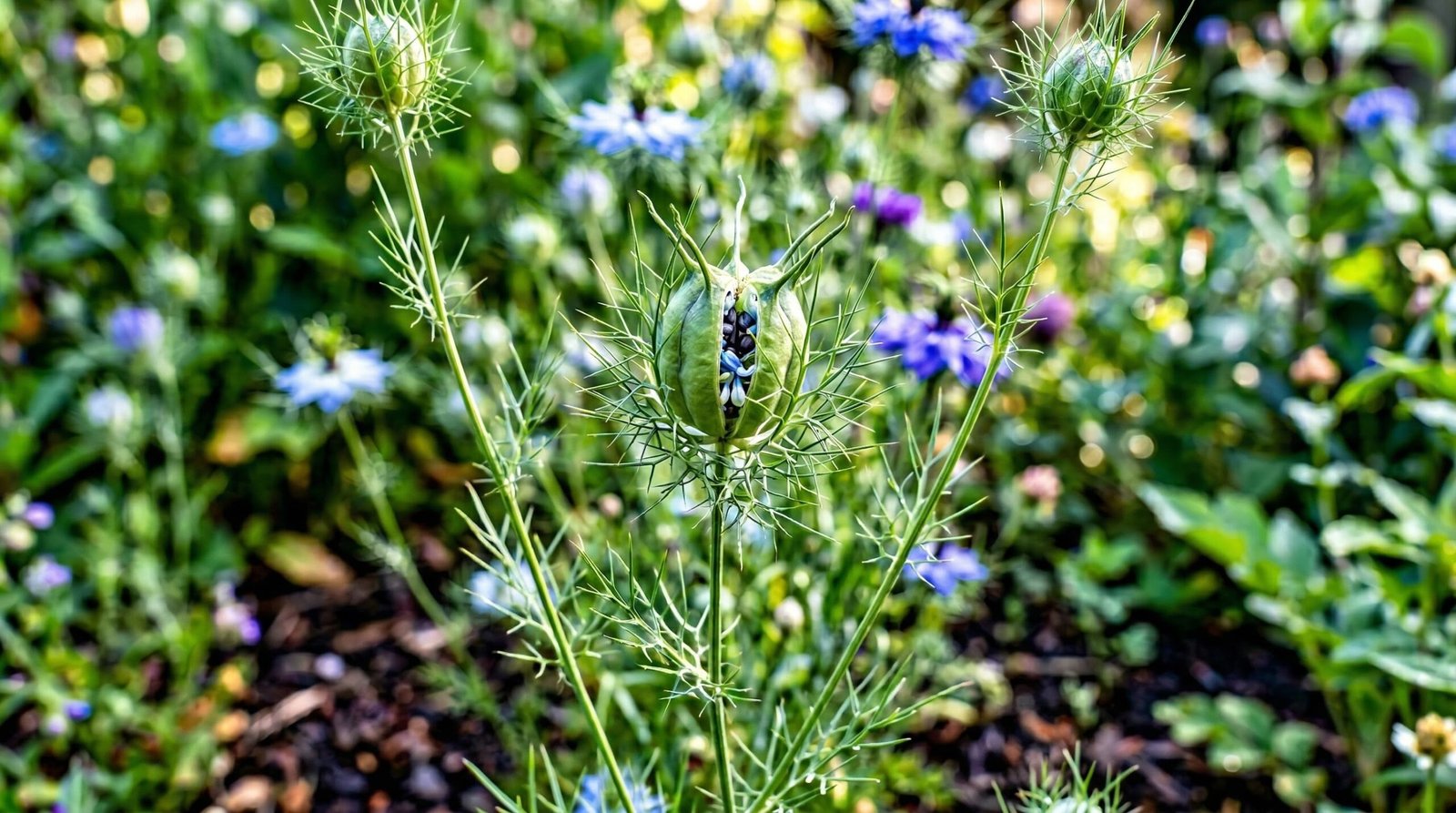 I wish you could stand beside me in the garden just after sunrise, when the heavy dew still clings to the foliage. The love-in-a-mist is blooming along the eastern fence line, catching the pale, slanted morning light in a way that makes the entire patch look like a low-lying cloud. This plant earns its name from the thread-like green bracts that surround each flower, creating a hazy, soft-focus halo around the petals. When you look closely, the flowers themselves are painted in the coolest, most soothing shades of icy blue, chalky white, and a muted, bruised plum. The petals have a papery thinness to them, catching the breeze and shivering on their slender stalks. I often find myself running a hand over the tops of the plants just to feel the feathery resistance of the foliage against my palms. It is a quiet flower, lacking the heavy perfume of a rose, but it carries a faint, sharp scent of fresh green sap and damp earth that rises when the sun finally warms the soil.