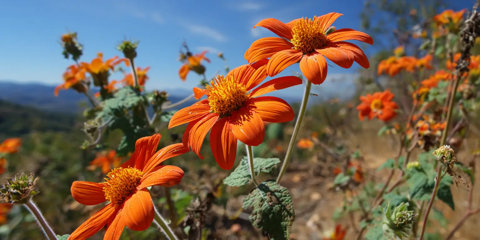 This species is the classic Mexican sunflower for North American gardens. It is a warm season annual with bright orange to red orange daisylike flowers. It thrives in full sun and well drained, lean soils. It blooms from midsummer to frost in most regions. It draws bees, butterflies, and hummingbirds. It may need staking in windy locations.