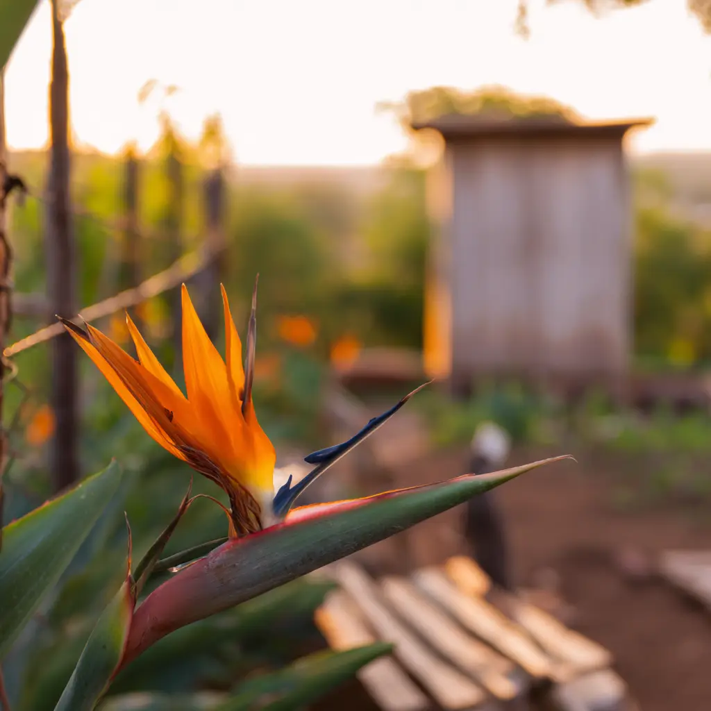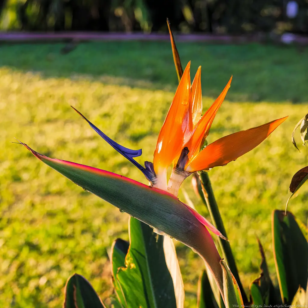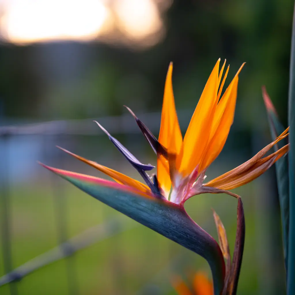 Tropical perennial with orange and blue crane‑like flowers where winters are mild or indoors elsewhere.