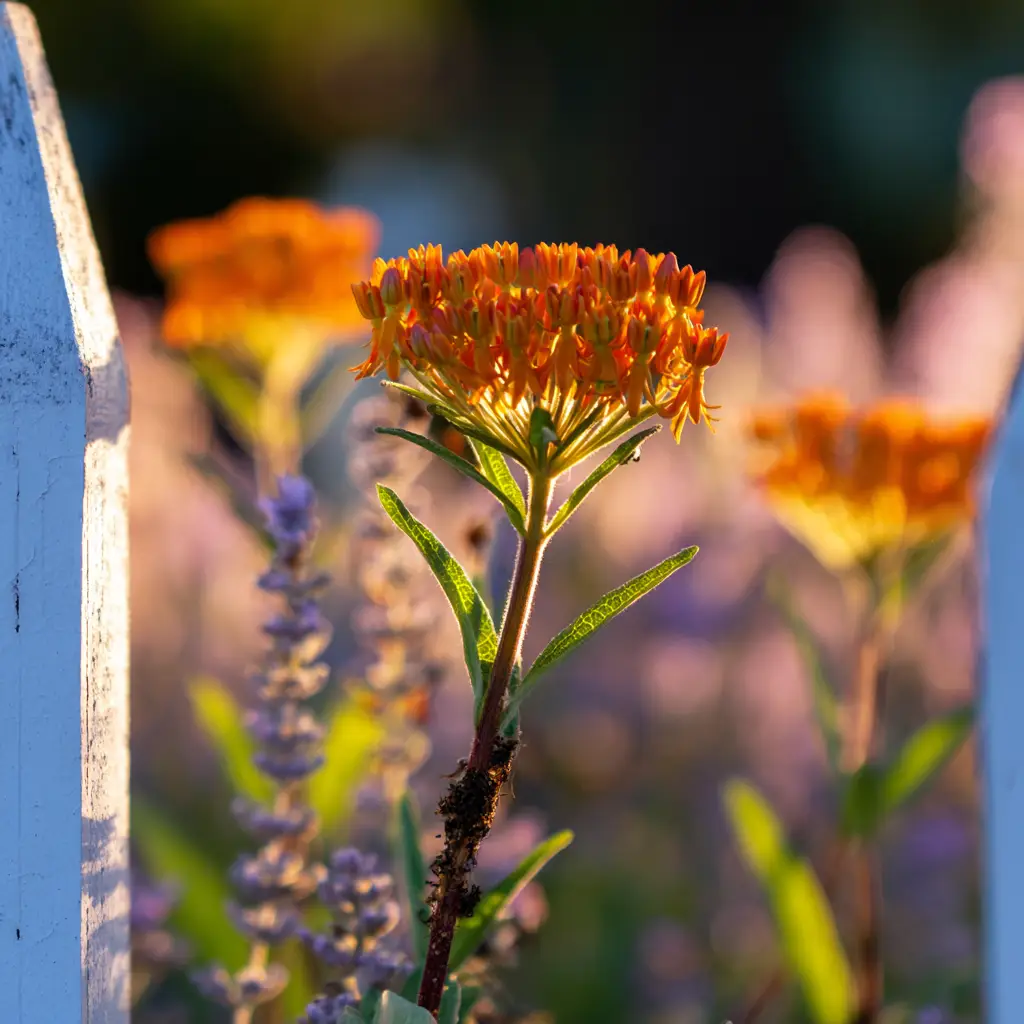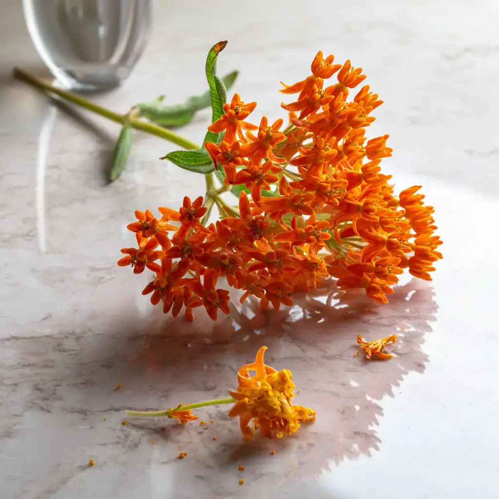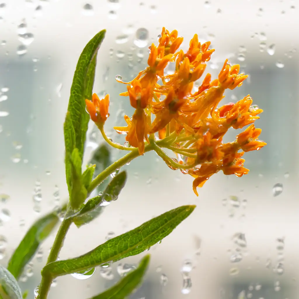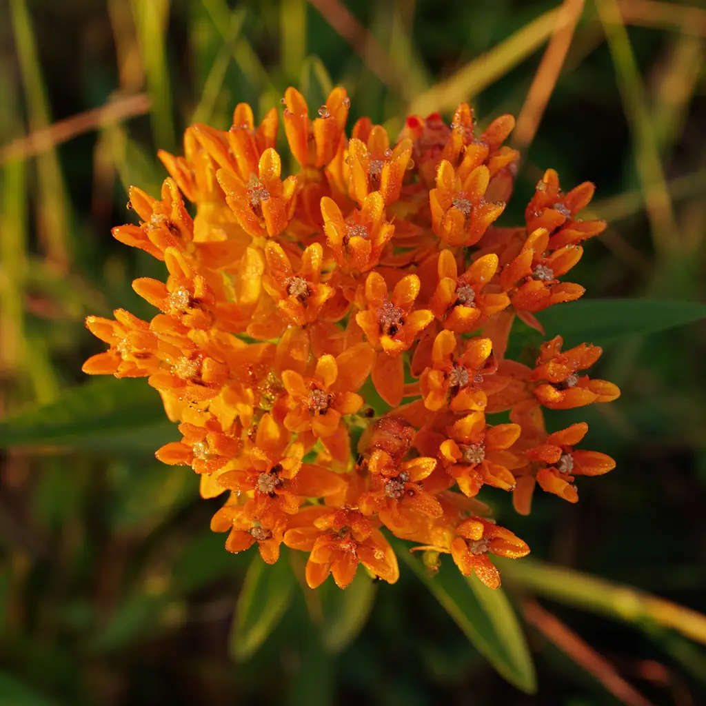 Native milkweed with clusters of blazing orange that feed monarchs and other pollinators.
