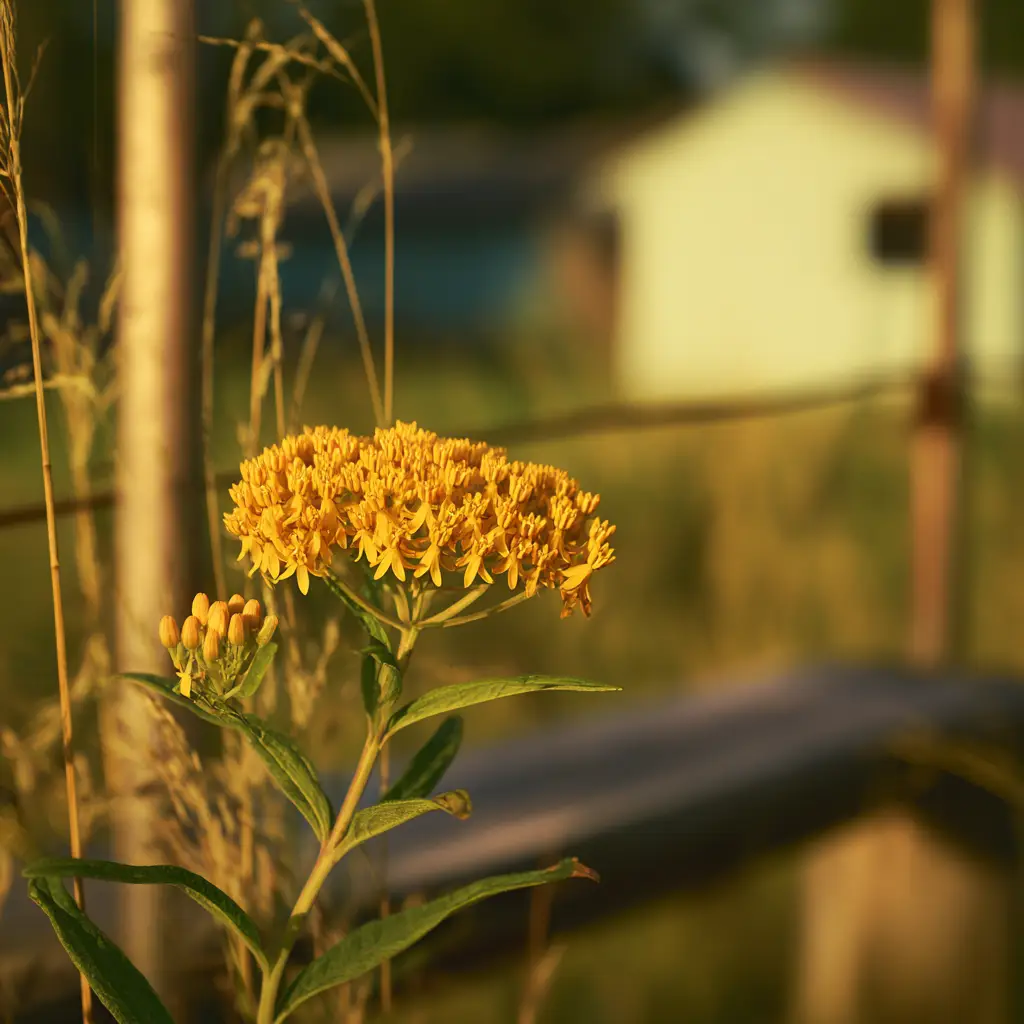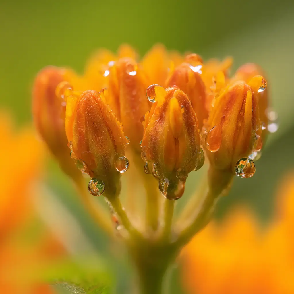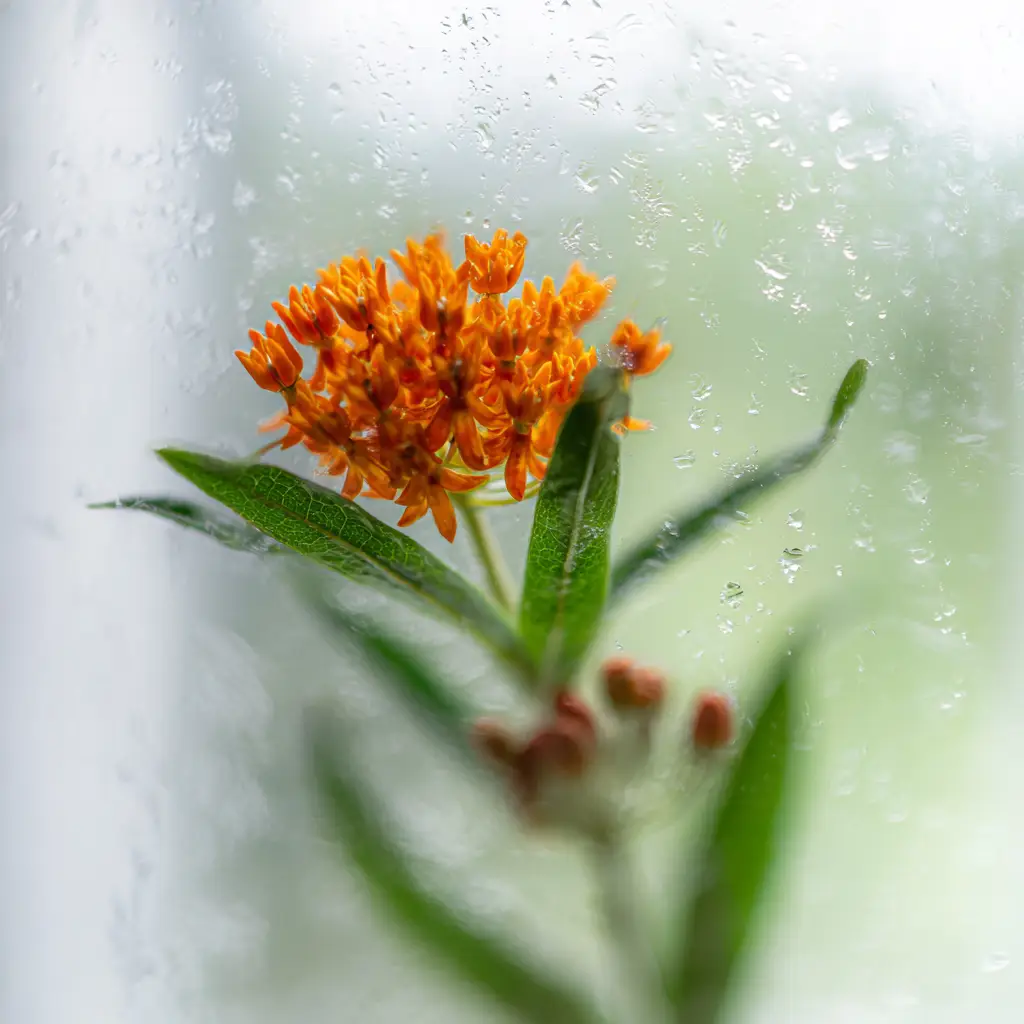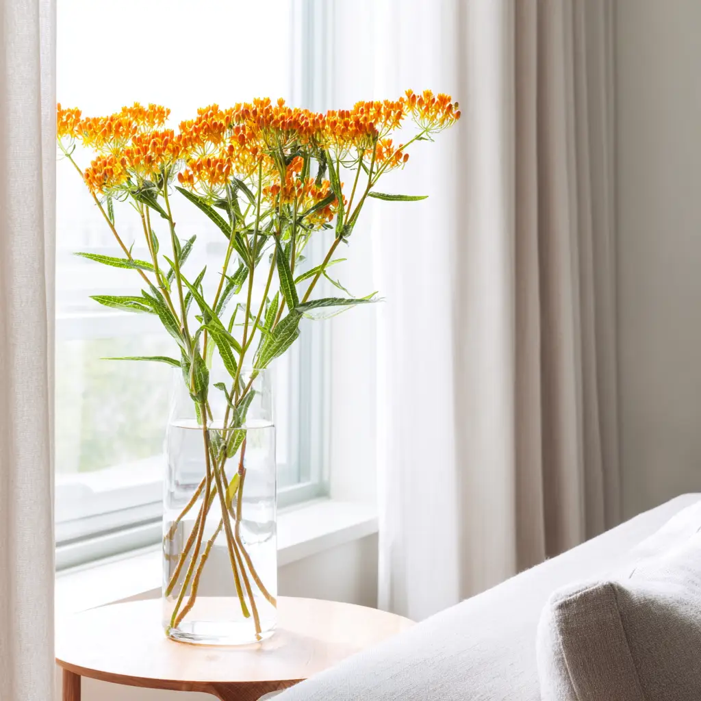 Native milkweed with clusters of blazing orange that feed monarchs and other pollinators.