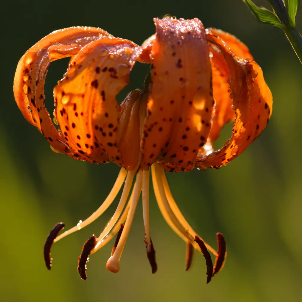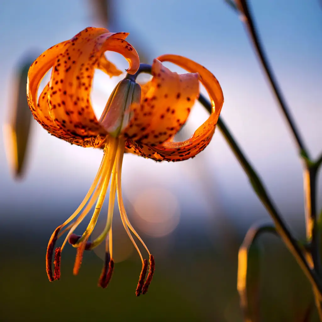 Spotted, recurved orange petals on mid‑to‑late summer lilies with tall, architectural stems.