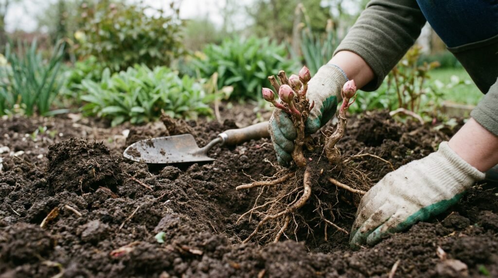 This is where most failures happen. Peonies planted too deep will not bloom. It is that simple, and it is extremely common.