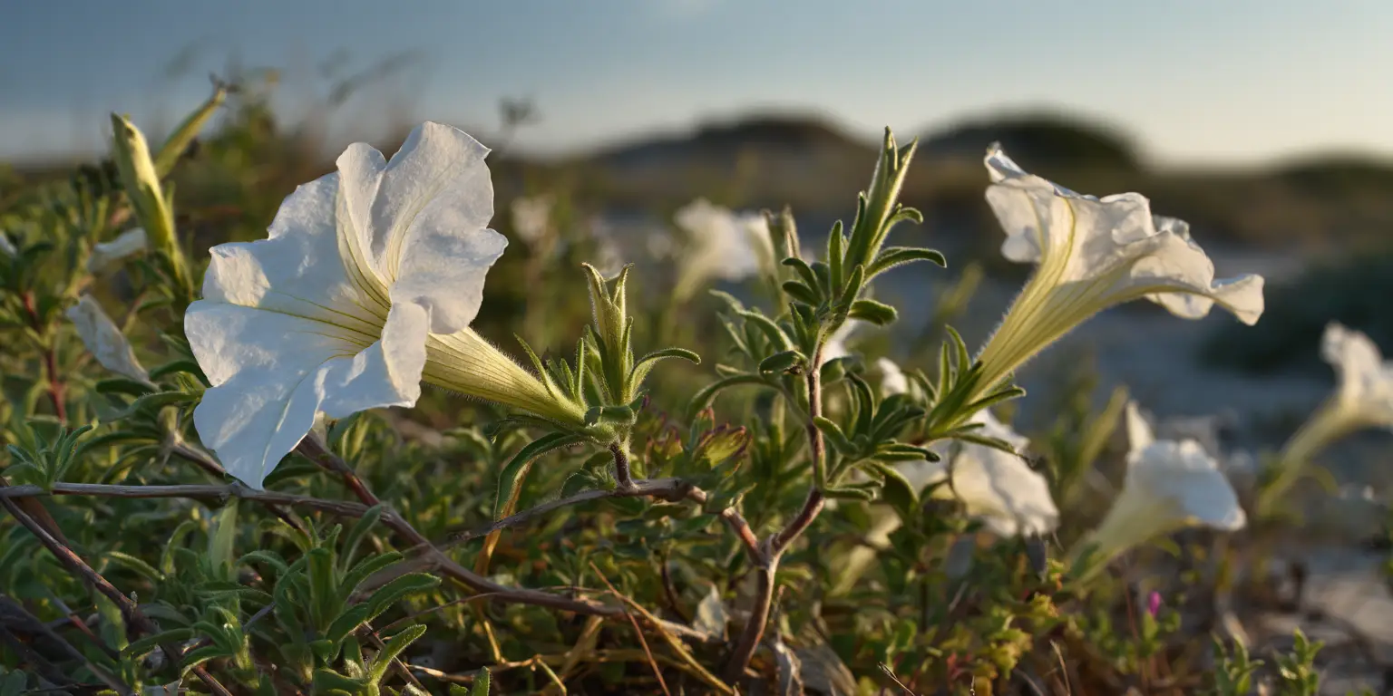 Petunia axillaris is the white, night‑scented species that contributed fragrance and tube length to many garden petunias. It stands out for strong evening perfume and large white trumpets that attract nocturnal moths. Plants are vigorous and flower best in full sun with well‑drained soil. They suit night gardens, patios, and containers where fragrance is valued. Most gardeners grow it as an annual because it is frost tender in North America. Plants may sprawl and benefit from occasional pinching to keep shape.