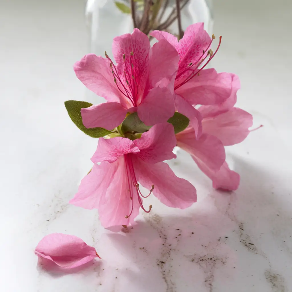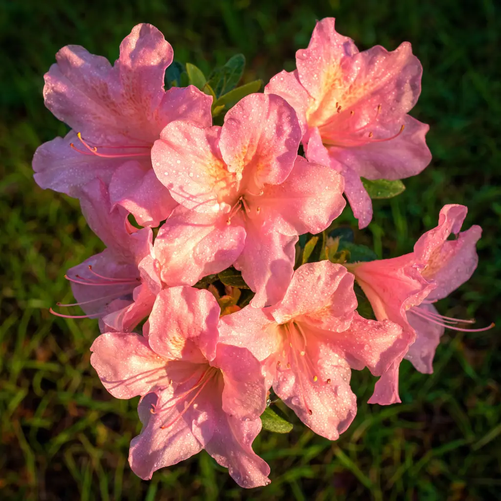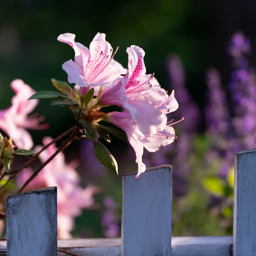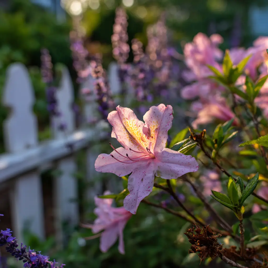 Woody shrubs with clouds of pink funnel‑shaped flowers; prefers acidic soil and light shade.