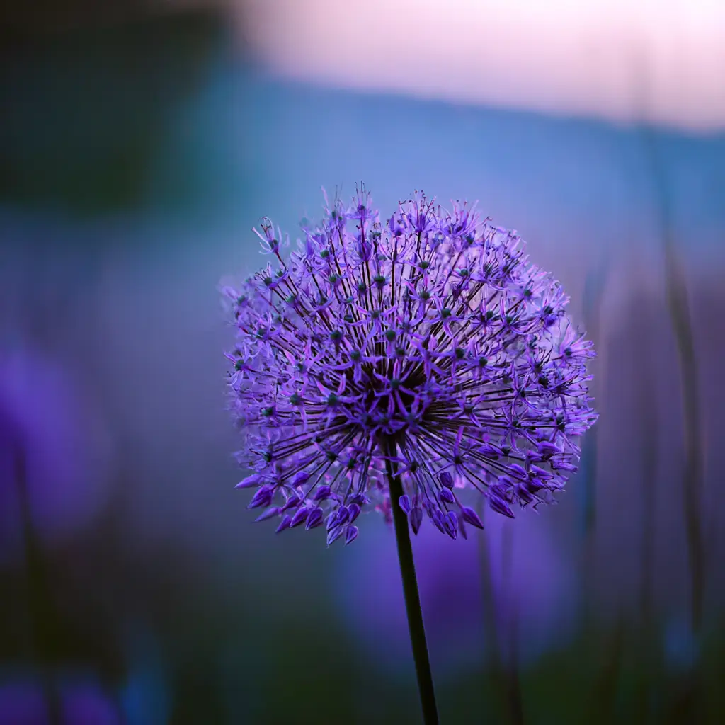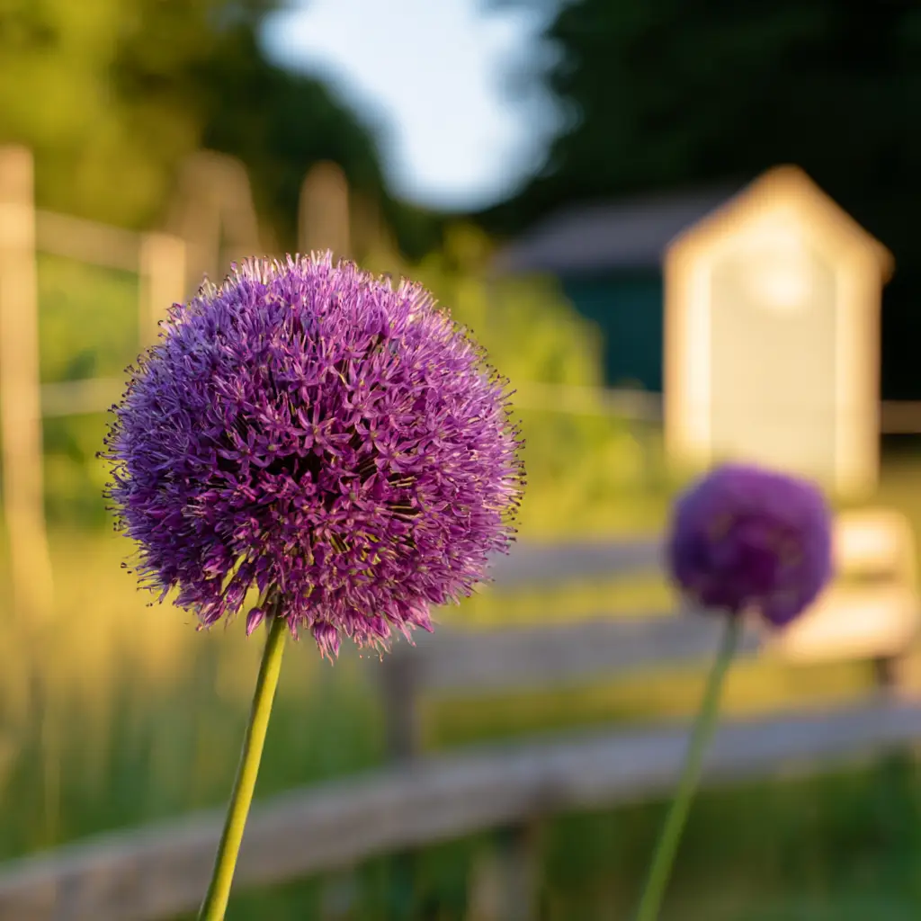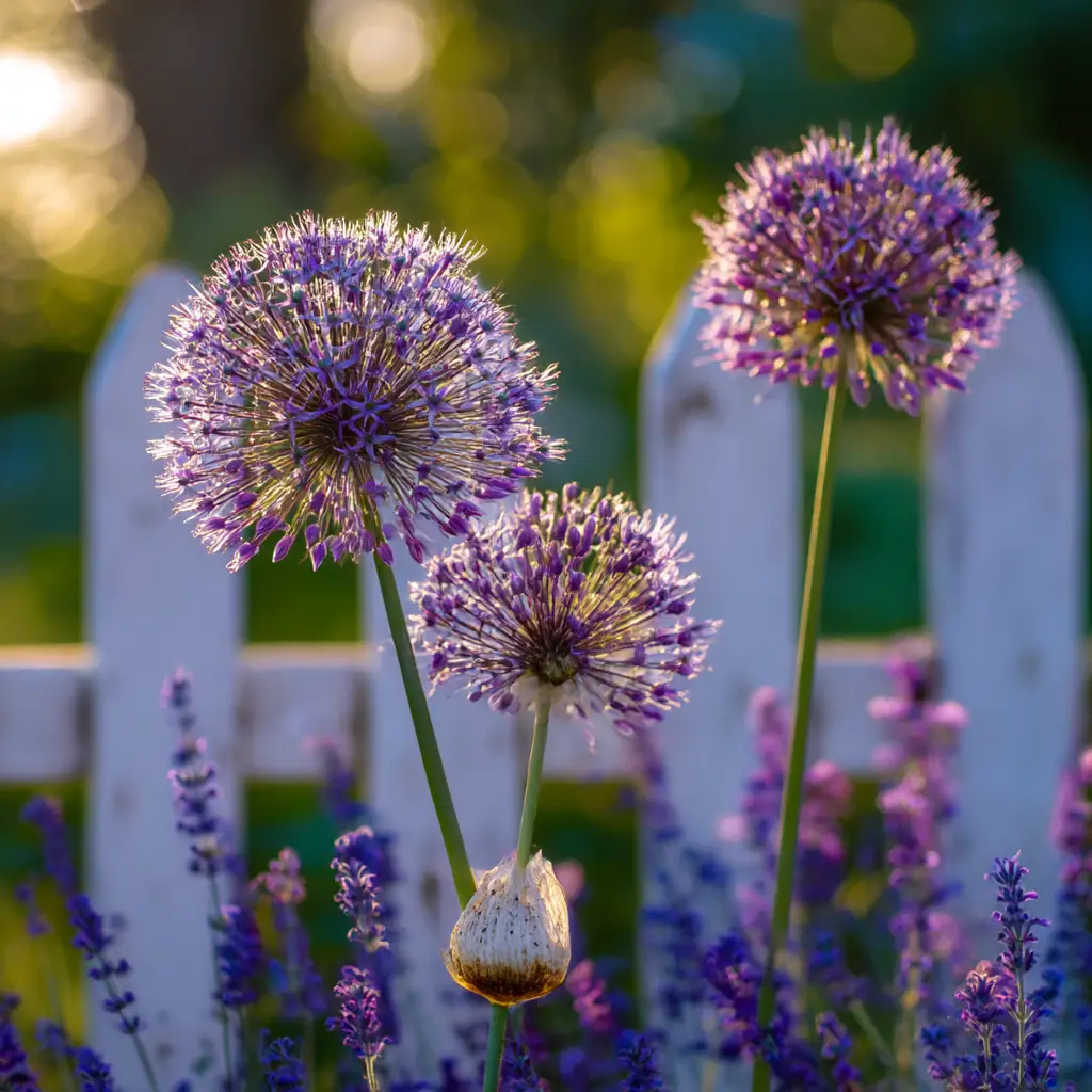 Ornamental onions with globe-shaped purple umbels on tall stems after spring bulbs fade.