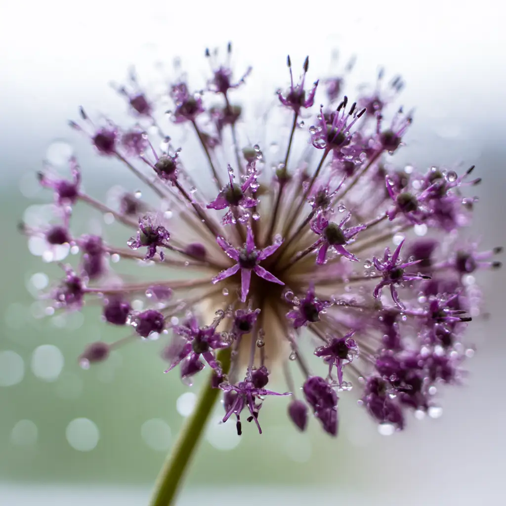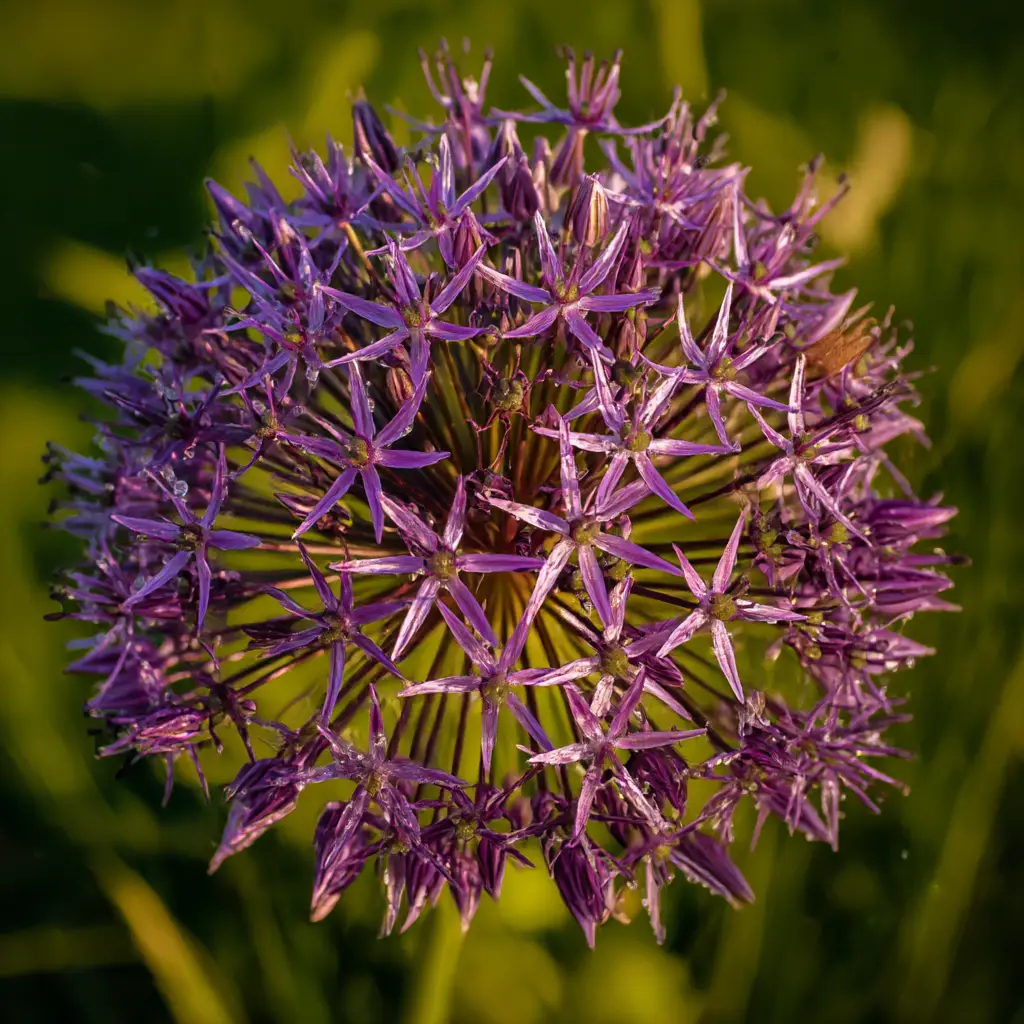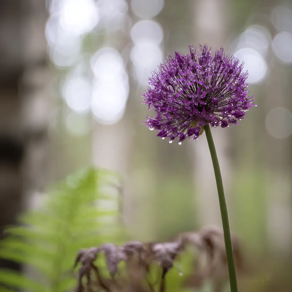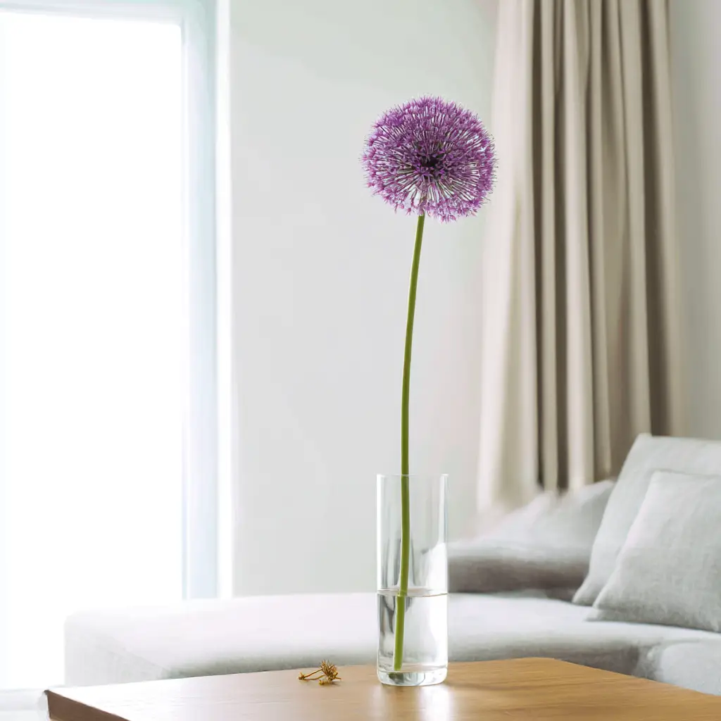 Ornamental onions with globe-shaped purple umbels on tall stems after spring bulbs fade.