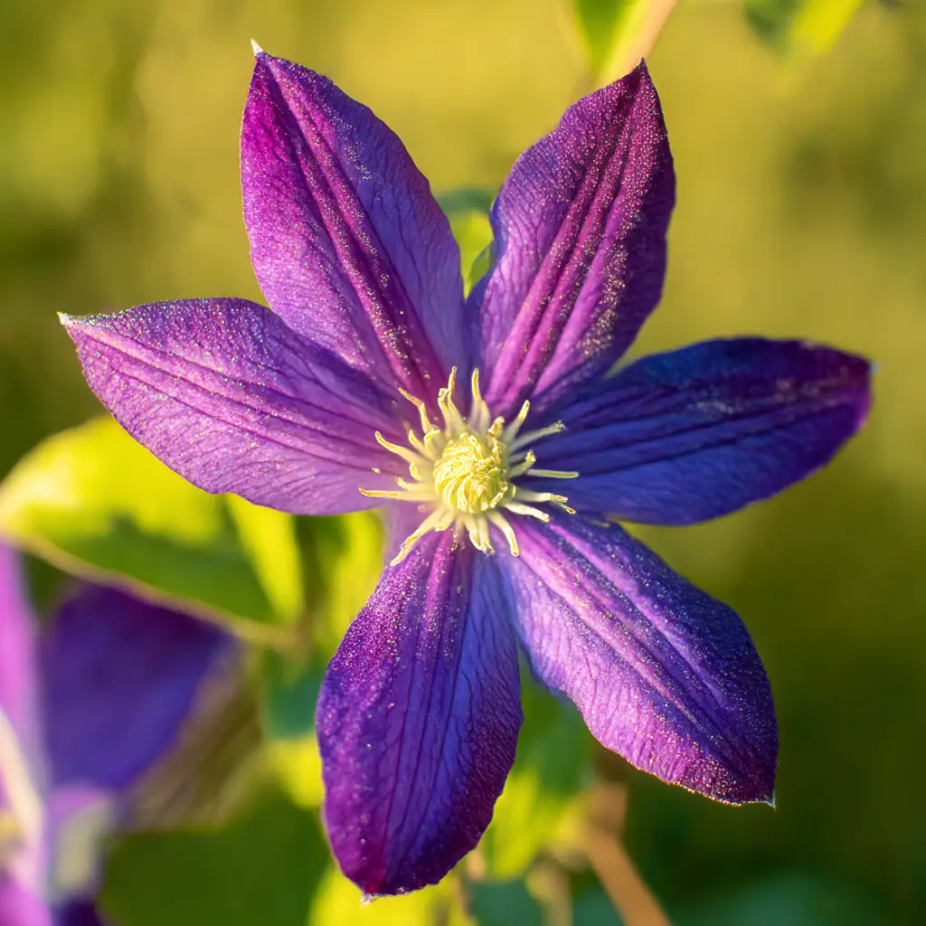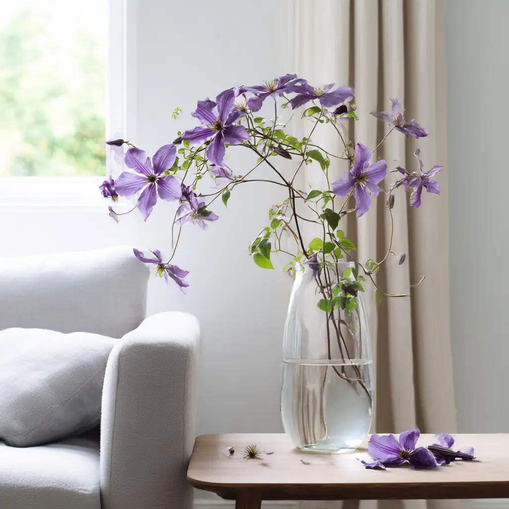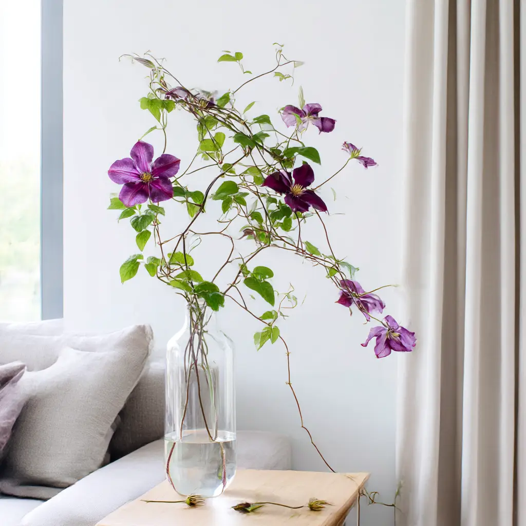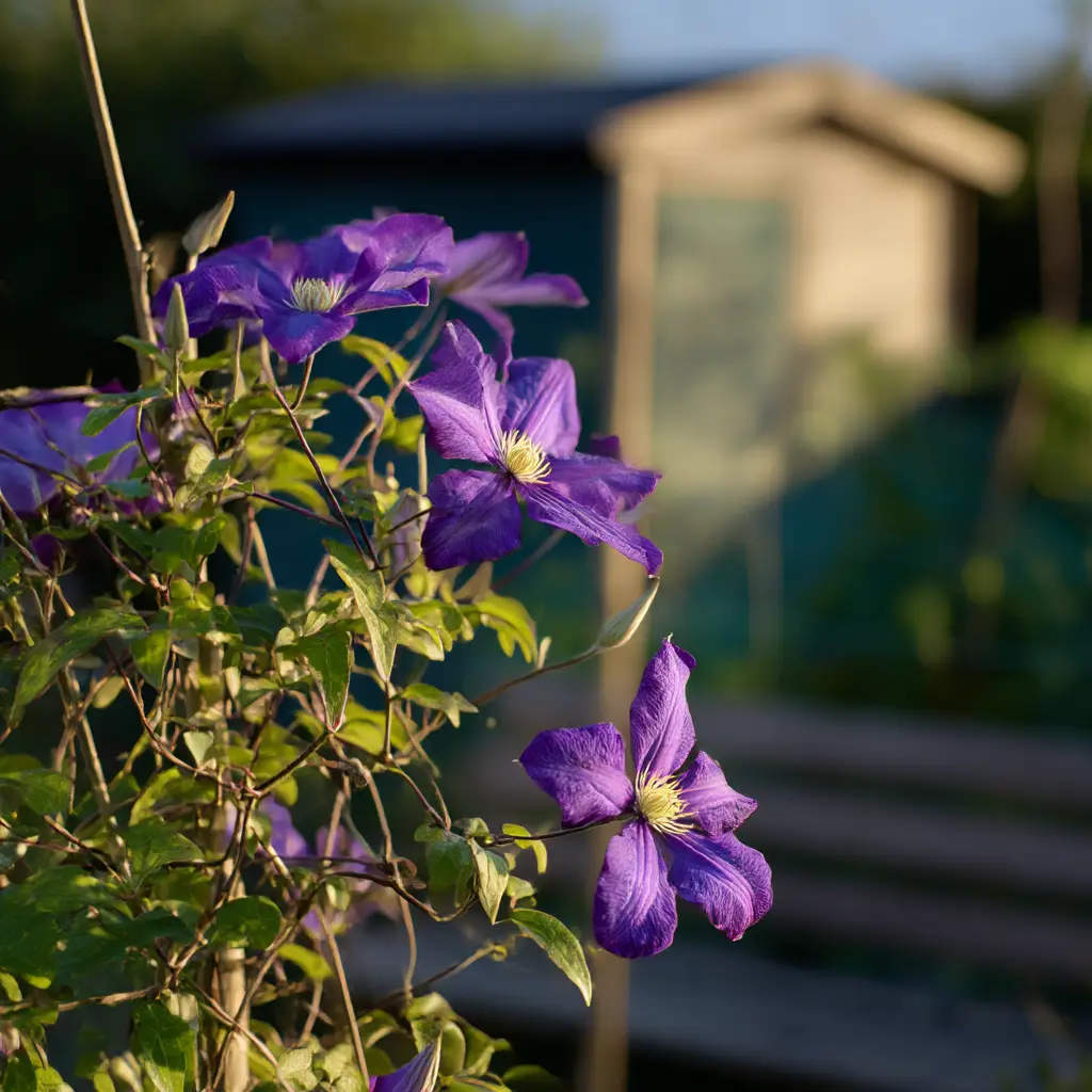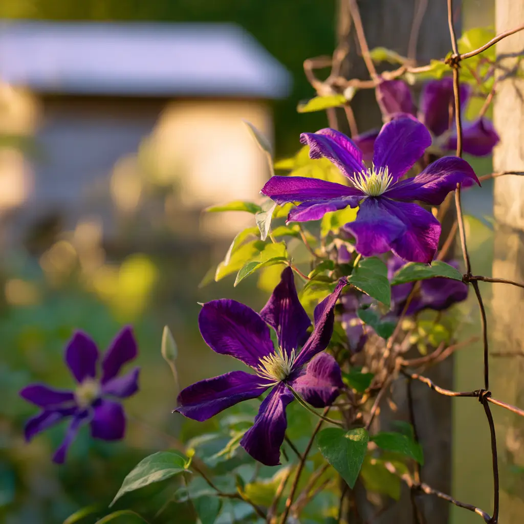 Vigorous climber producing large purple or violet star-shaped flowers on trellises and fences.