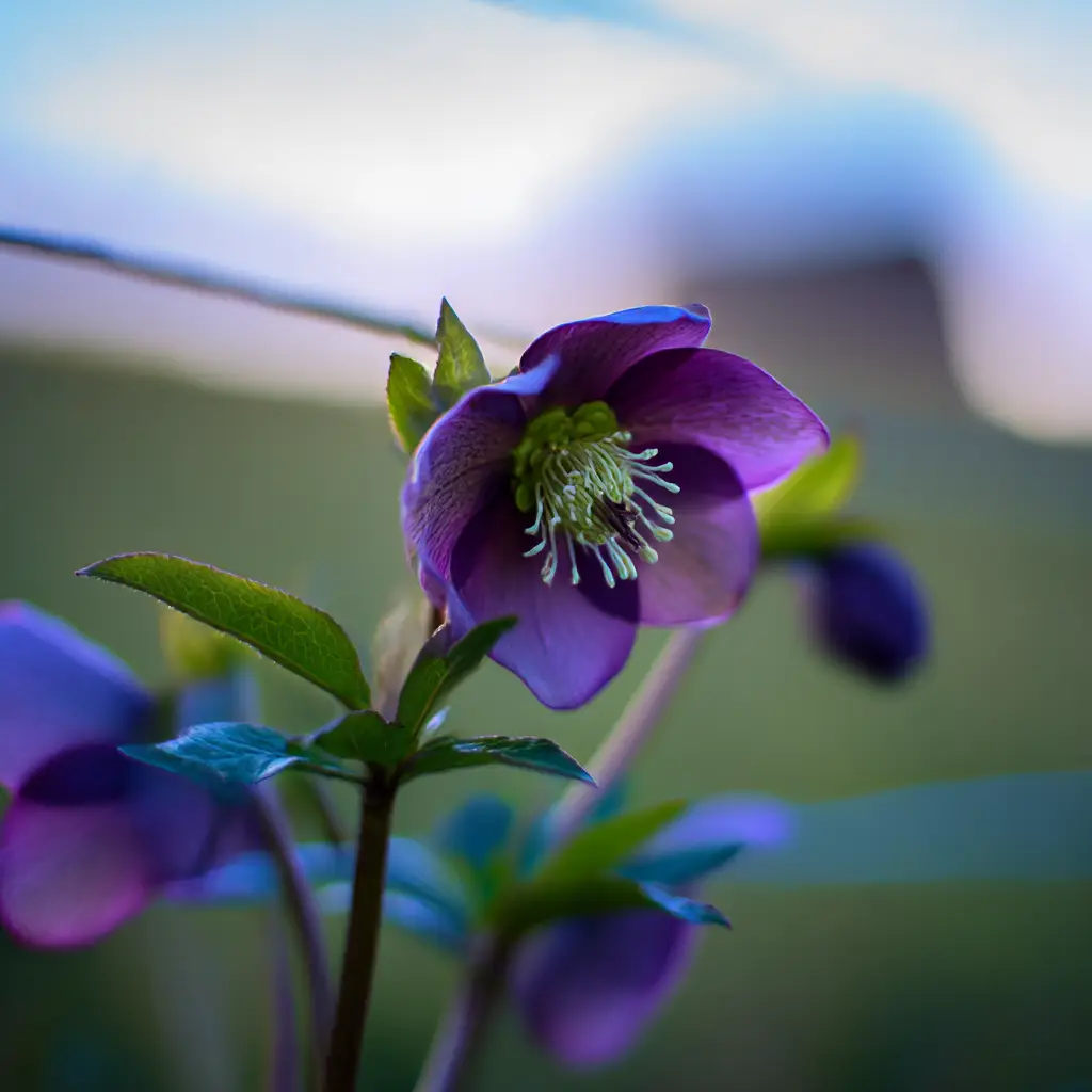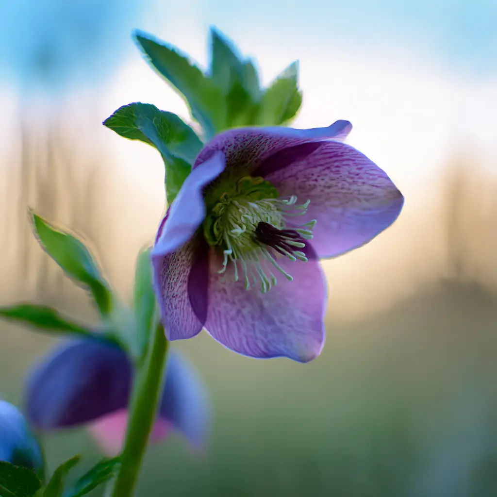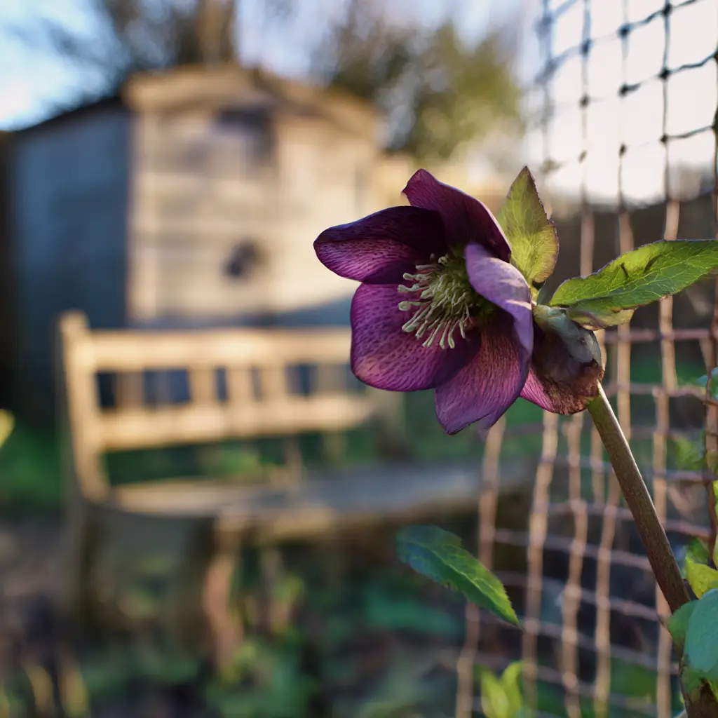 Evergreen perennial for shade with nodding February to March flowers in dusky purples.