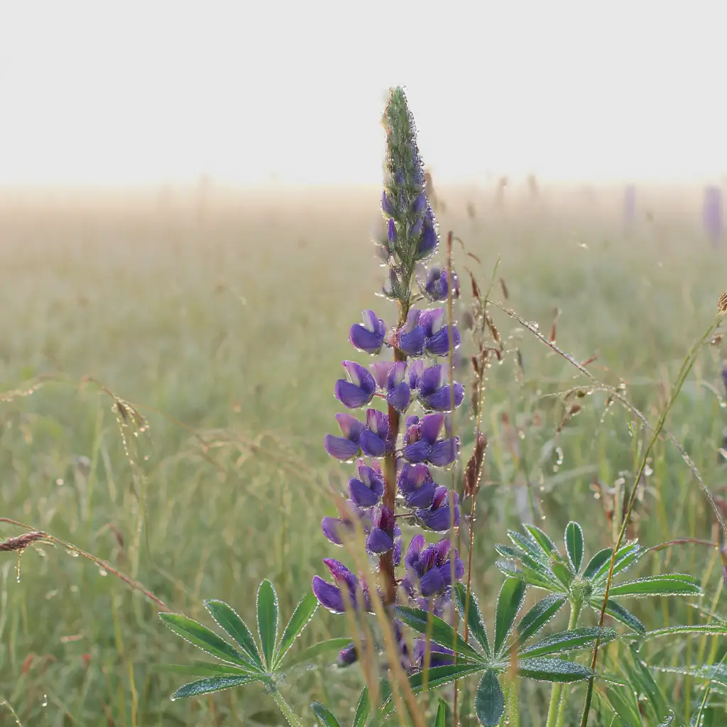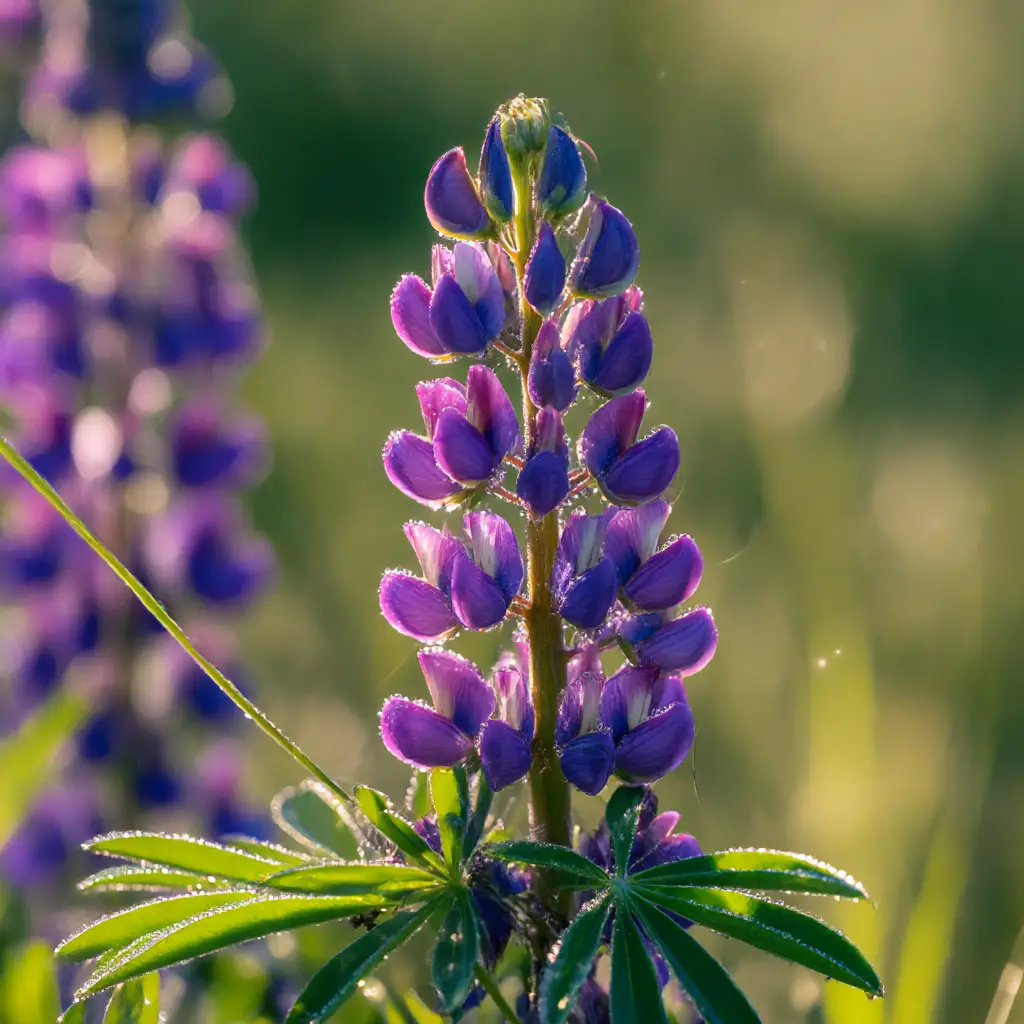 Spiky racemes in many purples over palmate leaves in late spring to early summer.