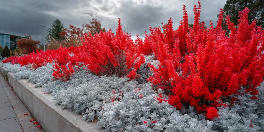 - Because it has an upright, airy form, Scarlet Sage pairs well with bushier or lower-growing plants at its feet. Consider edging a Scarlet Sage display with colorful annuals like marigolds or petunias, or foliage plants like silver dusty miller, to cover the base and provide a nice color contrast. Its red also complements sun-loving orange flowers and stands out dramatically next to deep violet blooms or nearly black flowers if you have any in your design.