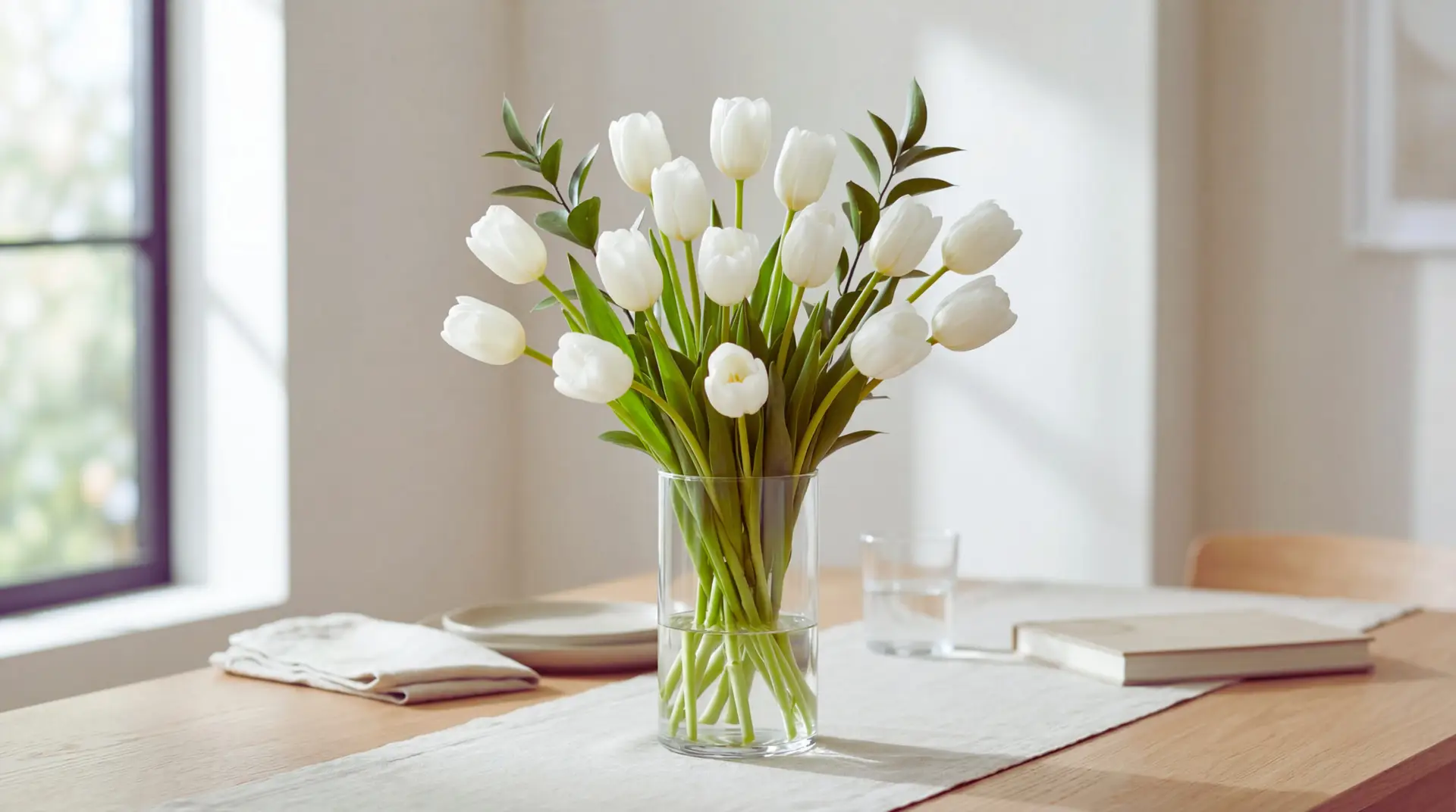 Ingredients: 15 white tulip stems, 2 Italian ruscus stems